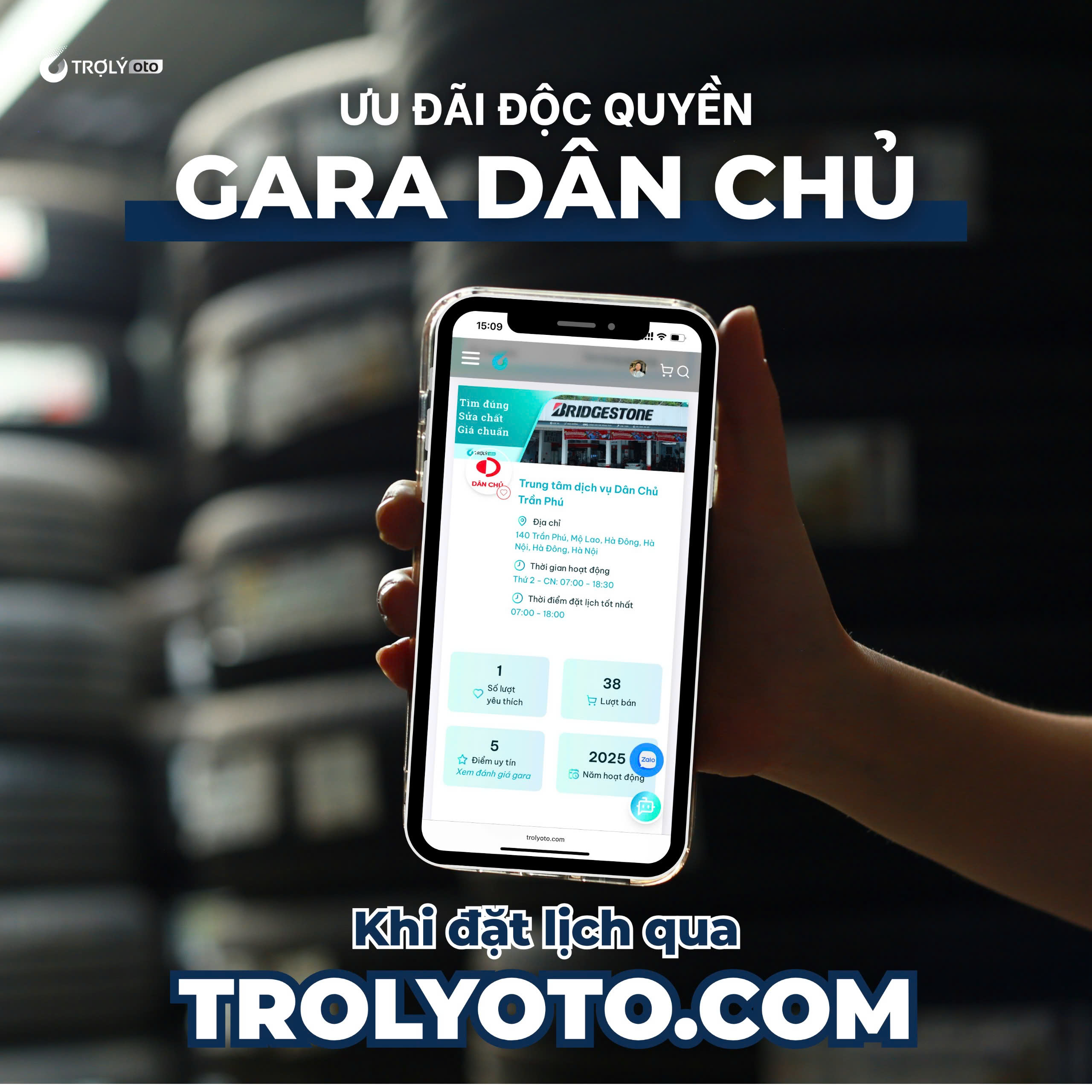 Trung tâm lốp xe & Chăm sóc xe cao cấp Dân Chủ đã chính thức có mặt trên TROLYoto – nền tảng số kết nối giữa chủ xe và các gara uy tín. Đây là bước ngoặt quan trọng giúp Dân Chủ tiếp cận được nhiều khách hàng hơn, đồng thời mang đến trải nghiệm đặt lịch dịch vụ tiện lợi, nhanh chóng hơn bao giờ hết.